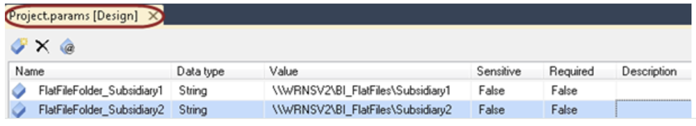 Note that project parameters do *not* have an expressions property to define their value. They are intended to hold a literal value which does not change while the package executes.